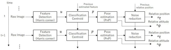 The estimator is composed of the following four parts: (1) feature detection, (2) inlier extraction, (3) relative pose estimation, and (4) noise reduction.