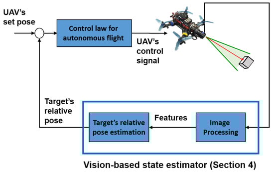In conventional research on vision systems for UAVs, visual simultaneous localization and mapping (Visual SLAM) and visual odometry (VO) for vision-based navigation are the main topics. The V-SLAM technique constructs a live map of the surrounding environment passed by a UAV, and the UAV localizes itself relative to this constructed map [4,5]. VO estimates the egomotion of a UAV using successive captured images instead of constructing a complete environmental map of the UAV [6]. These studies focused on the recognition of a 3D environment, and UAVs were controlled based on the recognition result. However, the computational cost of V-SLAM is high, and the processing speed is not very high.