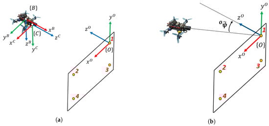 There are three coordinate systems in our system: the object coordinate system , the camera coordinate system , and the UAV’s body coordinate system , as shown in Figure 8a. We can obtain and directly by PnP.