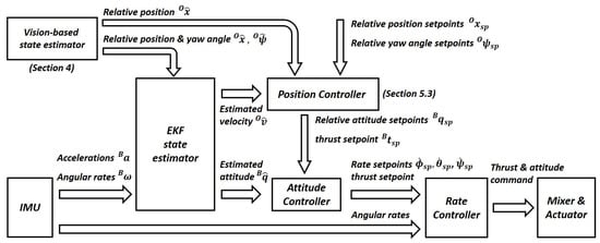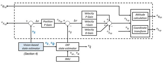 We built our visual servoing controller based on the PX4 flight controller architecture [47]. Figure 9 shows the control diagram for the position hold flight. To achieve position hold control, first the current vehicle states and are estimated by a vision-based state estimator. Then, the position controller obtains the estimated relative position directly with a known relative attitude setpoint and thrust setpoint .