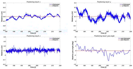 Considering the possibility of electromagnetic interference, we estimate the relative attitude by using a vision estimator instead of a magnetometer. The relative yaw angle shown in Figure 8b is calculated by decomposing the relative rotation matrix derived from the PnP algorithm mentioned in the previous section. For the attitude control, the relative yaw angle estimation is used as an observation, and this is integrated with the IMU in the EKF state estimator.