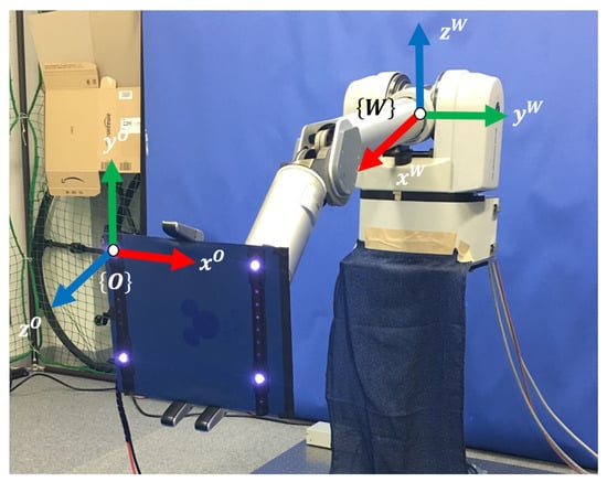In the experiment, we prepared a sample moving target as a reference for visual servoing to verify the performance quantitatively. For convenience of fast feature detection in the image processing, we attached four LED lights on a plate to serve as the moving target, as shown in Figure 3a. We define the coordinates of each LED as , , , from points 1–4 respectively. For moving the target plate, we used a Barrett WAM 7-DoF robot manipulator, as shown in Figure 3b, and moved it with different speeds and accelerations [40].