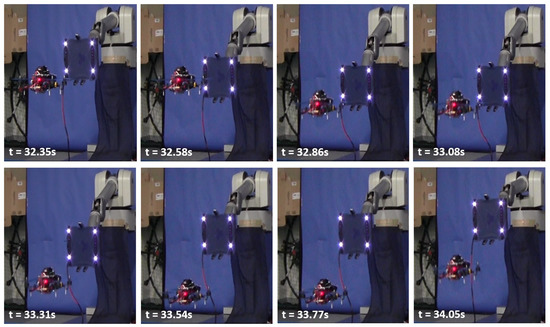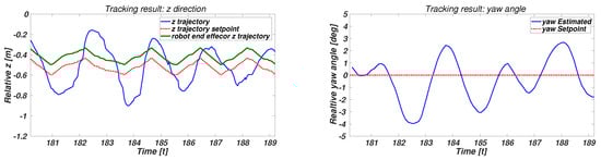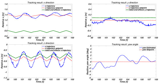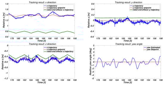 The experimental results showed that the positional tracking mean errors were [mm] with standard deviations [mm] in the x, y, and z directions, respectively. The angular tracking mean error was with a standard deviation in the yaw direction. Since the relative setpoint was [m] in the x, y, and z directions with respect to the object, we can see the position deviation between the UAV’s trajectories and the robot end effector during the tracking.