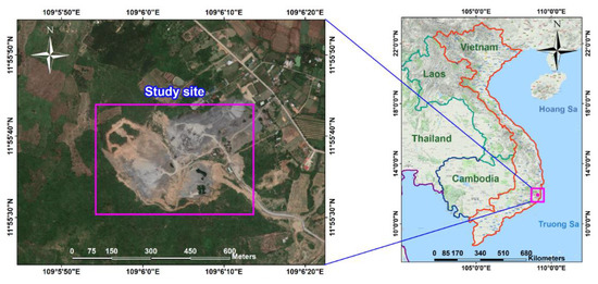 This study was undertaken at a quarry mine in Vietnam, where the distance from residential was about 450–500 m (Figure 1). Herein, blasting was used as the primary technique for rock fragmentation using 75 mm of the borehole. Although many solutions have been proposed to minimize the distance of fly-rock; however, there are still many potential risks of unsafe activity due to fly-rock.