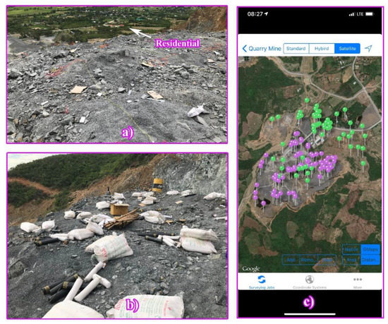(a) Blast points; (b) ANFO explosive (ammonium nitrate/fuel oil); (c) iGeoTrans app with the monitoring points.