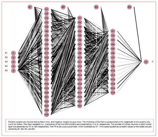 As illustrated in Figure 5, five ANN models were developed first; then, they were combined as a new generation of ANN model (i.e., EANNs model). To avoid the over-fitting of the ANN models, the original dataset was normalized by a min–max scale in the range of [-1, 1]. Finally, five ANN models were selected for predicting FR in the first step, including ANN 5-7-5-1, ANN 5-10-8-1, ANN 5-14-9-1, ANN 5-18-13-1, and ANN 5-21-16-1. An ANN model for predicting FR in this study is illustrated in Figure 6. Subsequently, an ensemble of the five developed ANN models was conducted (i.e., EANNs model). The structure of the proposed EANNs model is shown in Figure 7. Accordingly, the structure of the EANNs model includes three hidden layers (i.e., 5-25-21-15-1); therefore, to have a complete conclusion, the EANNs model was used to train and test the original data (called ANN 5-25-21-15-1 model). The results of the FR predictive models are computed in Table 2 and Table 3.
