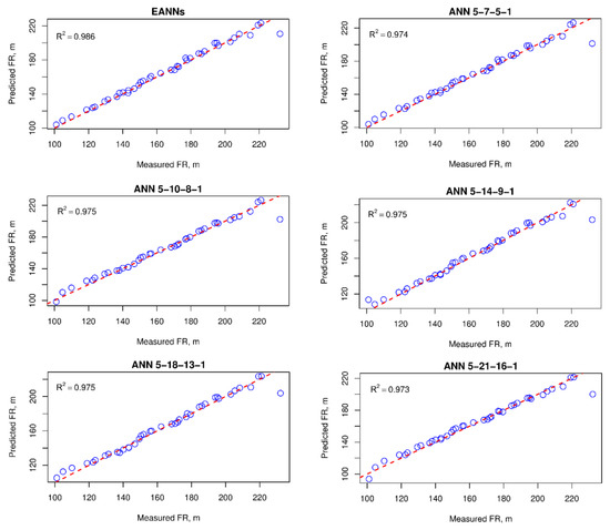 Based on the statistical indexes in Table 2 and Table 3, the ANN models (six sub-models) performed very well in estimating FR. Their performance is relatively uniform. Notably, the third sub-model (i.e., ANN 5-14-9-1) seems to provide the lowest performance among the six ANN models. For the proposed EANNs model, the high red intensity has revealed that its performance is superior in this study. It should be noted that the EANNs model was developed based on an ensemble of the first five ANN models in Table 2 and Table 3, and the sixth ANN model was only developed based on the original database to compare with the EANNs model (with the new database based on the predictions of the first five ANN models). The promising results of the proposed EANNs model were validated through the statistical indexes in Table 2 and Table 3. Remarkably, the sixth ANN model (i.e., ANN 5-25-21-15-1) has three hidden layers that have the same structure as those of the proposed EANNs model; however, its performance was lower than those of the proposed EANNs model. Thus, the use of the available ANN models as the sub-models to build a new model (i.e., EANNs model) has led to significant improvement in predicting FR. Figure 8 shows the accuracy of different ANN and EANNs models. Furthermore, a comparison of the proposed EANNs model (on the new database) and an ANN model with the same structure (on the original database) is shown in Figure 9.