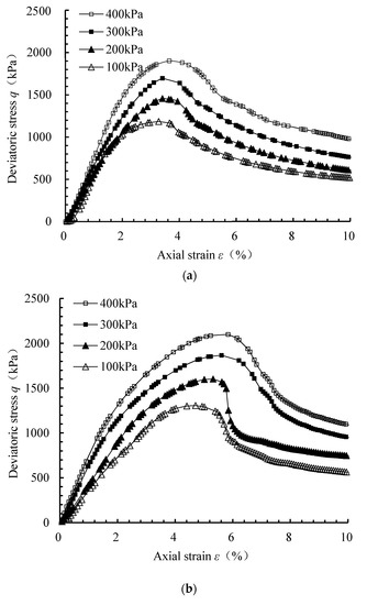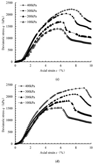 Figure 2 shows the curves between deviatoric stress q and axial strain ε curve (hereinafter referred to as “stress–strain curve”) of PCS samples. It can be seen that the stress–strain curves of the samples are all softening curves. The axial strain ε was considered within 10%, which is often the maximum strain level in practice.