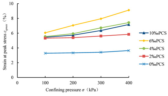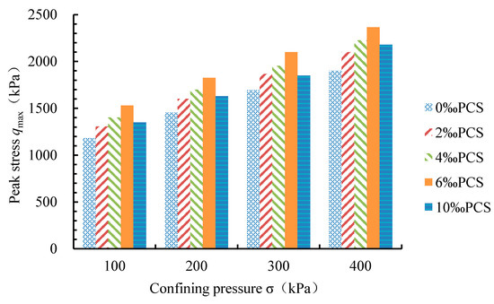The peak stress qmax and strain at peak stress diagrams of PCS samples can be obtained from the relevant data in Figure 2, as shown in Figure 3 and Figure 4.