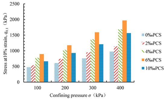 It is evident that after reaching peak stress, the stress reduces gradually with greater strain, which means that, after the peak stress, the sample still has some strength to bear the internal force and it is helpful to the ductile failure mold. The stress value with 10% axial strain is referred to as q0.1. The q0.1 diagram of PCS samples can be obtained from the relevant data in Figure 2, as shown in Figure 5.