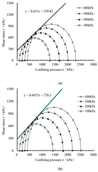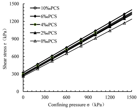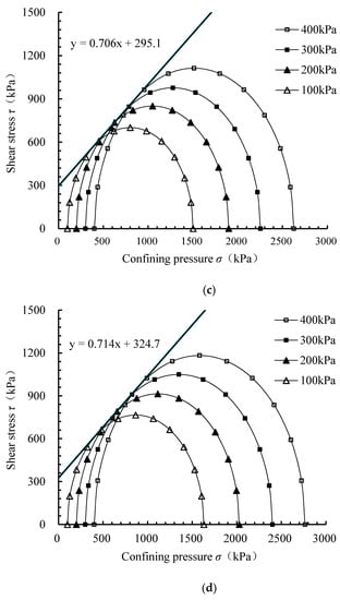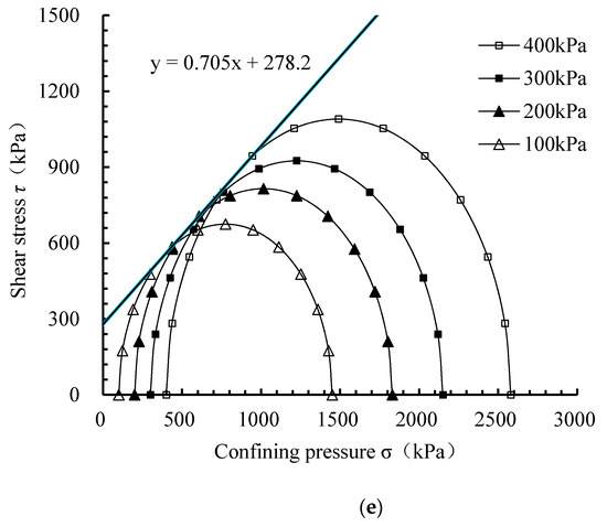 In order to draw the strength envelope of PCS samples and obtain their strength parameters, the peak of q is used as the failure point, where q = σ1 − σ3; taking the normal stress as the abscissa, the shear stress as the ordinate, (σ1 + σ3)/2 as the center, and (σ1 − σ3)/2 as the radius on the abscissa, the ultimate stress diagram is drawn on the τ–σ stress plan graph, as shown in Figure 6; and the envelope of the ultimate stress circle under different confining pressures is drawn as shown in Figure 7; the strength parameters c and ϕ of the samples are obtained from the strength envelope, as shown in Table 4.