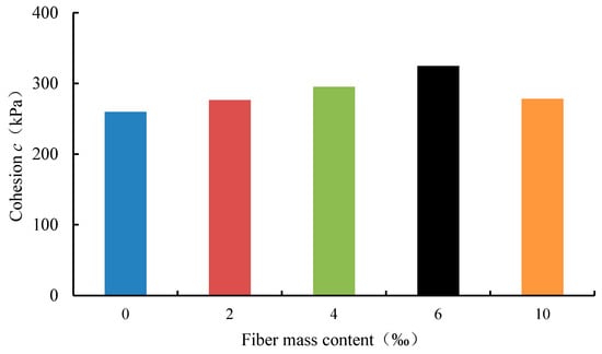 It can be seen from Table 4, together with Figure 8 and Figure 9 that the cohesion c and internal friction angle ϕ of 0‰ PCS sample are 259.8 kPa and 33.1°, respectively. Their values for 6‰ PCS sample are 324.7 kPa and 35.5°, respectively. In other words, when the fiber mass content increases from 0‰ to 6‰, the sample’s cohesion c and internal friction angle ϕ increase 25.9% and 7.4%, respectively. However, further increase in fiber mass content lead to a decrease in c and ϕ. When the fiber mass content is 6‰, c and ϕ reach their maximum values, indicating that the shear strength is enhanced. The existence of an optimal fiber mass content may be justified by considering the effect of fibers in a PCS sample. During the cement hydration process, the fibers were combined with the surrounding matrix (cement-treated soil); as a result, a fiber can offer tensile strength in the sample if the cement slurry can coat each fiber well. This condition can be fulfilled if the fiber content is low. With the increase of fiber content, the cement slurry could be relatively insufficient to combine each fiber with its surrounding matrix; in addition, the overlaps among fibers are even likely to undermine the cement hydration process. As such, the strength parameters of the PCS sample have a decreasing tendency when the fiber content is too large. For instance, the strength parameters decrease when the fiber mass content increases from 6‰ to 10‰. In this study, the optimal fiber mass content was found to be 6‰ as indicated in Figure 8 and Figure 9. A similar phenomenon was reported in reference [32], which examined the strength parameters of cement-tailings with fibers.