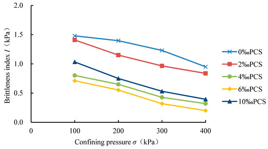 where qmax and q0.1 represent the peak stress and stress at 10% axial strain, respectively, and I represents the brittleness index. The brittleness index of PCS samples can be obtained by substituting the relevant data in Figure 2 into Equation (1), as shown in Figure 10. The figure indicates that: