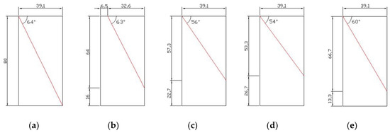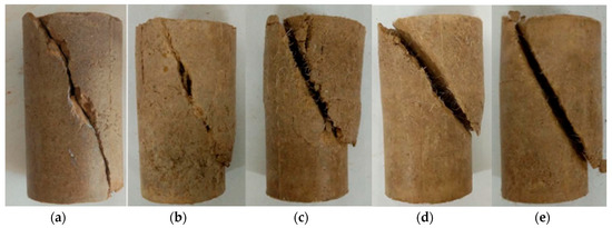 Fiber content plays an important role in the PCS’s failure model. Due to the confining pressure having no significant influence on the failure angle, in order to investigate the effect of fiber on the failure angle of cement subgrade soil samples, PCS samples with typical failure behavior [15] under 300 kPa confining pressure were selected, as shown in Figure 11. According to the failure pattern of these samples, the failure section diagram was drawn as shown in Figure 12. The dimensions are specified in mm, the oblique line is the failure surface of the sample, and the angle between the failure surface and the horizontal direction is determined as the failure angle. The relationship between the fiber mass content and the angle can be obtained from the data in Figure 12, as shown in Figure 13.