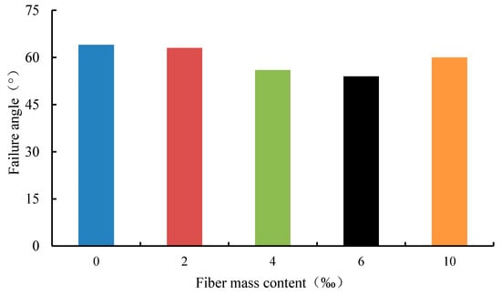 Figure 13 indicates that, under the same confining pressure, the failure angle of PCS samples first decreases and then increases as the fiber mass content increases. When the fiber mass content is 6‰, the failure angle reaches its minimal value. This value is 16% less than that of a 0‰ PCS sample, indicating that the incorporation of fiber can improve the brittle fracture pattern of a sample to some extent. When the fiber mass content further increases to 10‰, the failure angle is still less than that of a 0‰ PCS sample, and the modification is significantly improved with the increase in fiber mass content. The main reason is that when the fiber mass content is too large, the fibers are likely to overlap with each other in the soil; as a result, the soil cannot be well compacted. Hence, the modification effect is limited. In addition, when the fiber mass content is within a certain range, the fiber can better fill the voids inside the PCS sample, a more stable structure can be formed between the fiber and soil particles, thereby improving the failure form of the sample. On the contrary, when the fiber mass content is too high, the fibers readily overlap with each other in the soil. In this regard, neither can the soil be well compacted, nor can the fiber be well connected. As such, the failure angle of the sample is improved and the modification effect decreases.