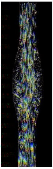 The acquired images were processed using hybrid Lagrangian particle tracking (HLPT). The tracking algorithm is based on the solution of the optical flow equation. It selects, within each image, areas where strong light intensity gradients exist []; such regions can be associated with tracer particles and can then be considered as good features to track in the sequence []. Once the features have been identified, the algorithm reconstructs the trajectories: the fluid motion is then described in a Lagrangian frame of reference, and the velocity of the particles is evaluated by calculating the displacement along the trajectory and the corresponding elapsed time.