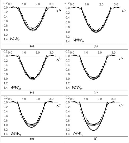 Normalized velocity profiles in correspondence of the maximum vessel diameter for various selected Re: (a) Re = 410, (b) Re = 600, (c) Re = 1100, (d) Re = 1600, (e) Re = 2000, and (f) Re = 2650. Data are from the first set of experiments (ID 1 to 6, Table 1). The profiles refer to the healthy aorta (triangles), the aneurysmatic dilatation (circles) and the analytical Poiseuille profile (black continuous line); the x axis is normalized by the radius of the healthy aorta, r. Flow direction is from up to down.