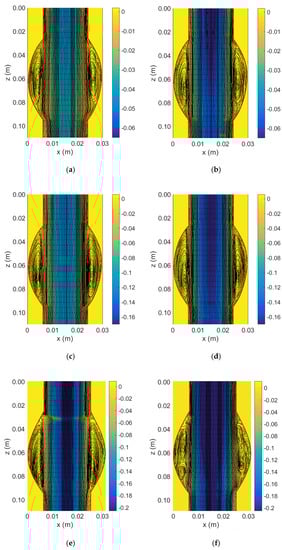 - The obtained discrete sets of pixels were then interpolated using sixth-order polynomials (see Figure A1b). Considering a 2D acquisition in the x-z plane, an equation x = f (z) is then obtained for both right and left wall profiles.
