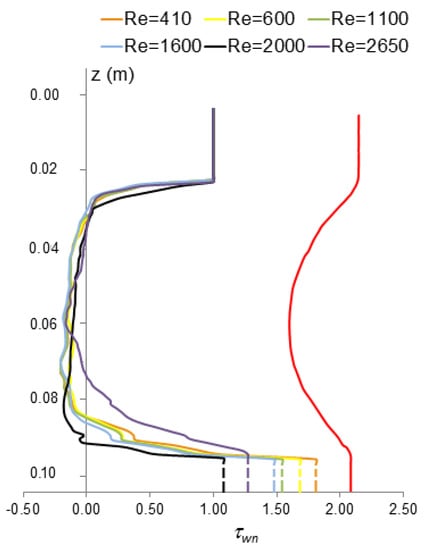 WSS in a vessel is the tangential force per unit area acted by the blood flow and is, by definition, calculated as the product of the spatial gradient of the velocity component normal to the wall and the fluid viscosity (see the Appendix for further details). Normalized WSSs τwn for varying Re are shown in Figure 6; the normalization is obtained considering the WSS of the healthy aorta τh, i.e., τwn = τw/τh, where τw is the WSS.