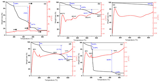 TGA/DTG profiles of (a) alginate, (b) γ-Fe2O3 particles, (c) f-CNT, (d) A/γ-Fe2O3, (e) A/γ-Fe2O3/f-CNT beads.