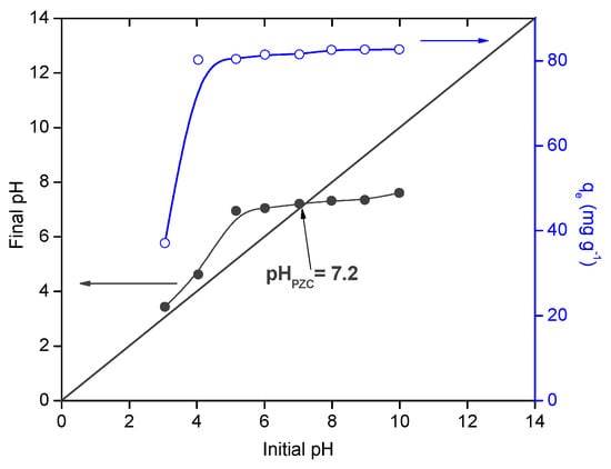 The pH of the solution is an important factor that could affect the adsorption process by controlling both the surface chemistry of the adsorbent and the speciation of the adsorbate. The experiments were carried out in a pH range of 3.0–10.0 and the results are reported in Figure 6. It could be observed that MB uptake increased from 37.1 to 82.7 mg g−1 with increasing the pH solution from 3 to 10. These results are directly related to the chemical surface properties of the adsorbent and MB molecules.
