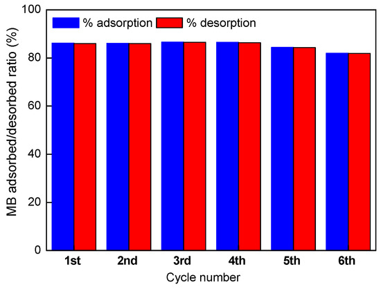 At low pH values, the functional groups present on the beads surface are protonated, which leads to reduce the electrostatic attractions between MB molecules and the adsorbent surface. This conduct to the diffusion of MB molecules to the acid solution. As it could be observed in the Figure, 6 consecutive adsorption-desorption tests using a nitric acid solution as elution reagent were assessed. Thus, A/γ-Fe2O3/f-CNT composite beads could be reused for 6 cycles maintaining its high adsorptive ability, observing similar MB adsorption/desorption ratio, ranging from 82% to 87%. The results confirmed that A/γ-Fe2O3/f-CNT beads are efficient adsorbents of methylene blue, since they can be rapidly and effectively regenerated. Same findings have been described in the literature [66].