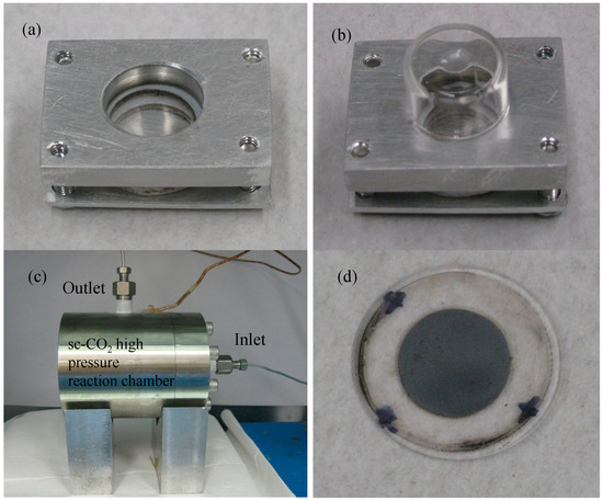 Apparatus used to form the samples. (a) Substrate holder with a diameter of approximately 1 cm. (b) Sample holder with a mini beaker on top. (c) sc-CO2 high-pressure reaction chamber, and (d) the final product.