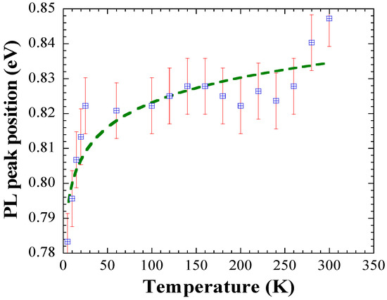 PL peak position versus temperature. The dashed line is a guide for the eyes.