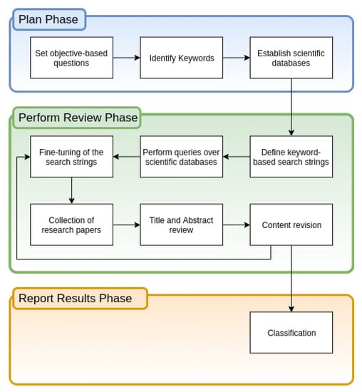 The plan phase allowed defining search strings and research digital repositories. The perform review phase focused on adapting search strings for every repository, collect preliminary results, extract relevant information, and selecting candidate papers. Finally, a full review of the remaining document was performed to report relevant findings and results.