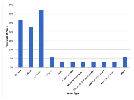 Information retrieval is one of the most important aspects of smart parking solutions, and for this process, a great variety of sensors offered in the market can be used. Among the different types of sensors for smart parking, the most common ones are ultrasonic, magnetometers, cameras (used for detecting vehicles and free slots), cellular sensors, and radars [41]. A summary of the type of sensors used on the reviewed papers is shown in Table 3.