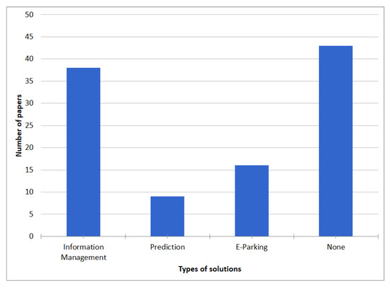 There are several works that aim to provide a classification of some components of a smart parking solution [13,19,20,21,22,23]. First, Revathi and Dhulipala [19] denote a classification of parking systems, where the authors list several types that refer to assisted parking search (APS), Information Systems (IS), payment, automated parking, reservation, park assistant among others. Likewise, they list and describe different technologies used (sensors, image processing, and RFID). The authors have defined the categories mentioned above, but they have not considered reviewing if all the listed categories appear in recent works to determine a trend of usage.