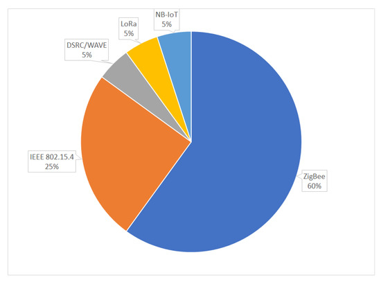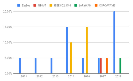 To implement a smart parking solution, several technological components are involved, such as sensors, networking infrastructure, and software solutions, among others. Regarding smart parking architectures, there are several works that have been presented by industry and the scientific community. Some of them focus on the solution, others on the algorithms, software, or systems, whereas others briefly state the technology of the sensors. For instance, the authors of [31] propose an approach based on artificial intelligence (agents) to find available spots. In [32], the authors discuss different approaches to implement Smart Parking solutions; it considers the whole ecosystem of such type of solutions which basically involves sensors, gateway selection, edge processing, and data center analysis. For its part, the authors of [33] depict an architecture totally based on ZigBee technology. Moreover, the authors of [9] suggest artificial intelligence for optimizing park search, but barely specify the technical details of implementation, such as specific protocols or sensor types. Likewise, the work proposed in [34], shows the use of Bluetooth Low Energy (BLE) as a protocol for connecting sensors and gateways. Bluetooth is a wireless protocol that supports connection between end-devices. The BLE version consumes very few energy and is part of the wireless IoT stack protocol. Other solutions, like those in [35], suggest the use of IR sensors for its architecture. Smartphones are also considered in these solutions particularly to find available spaces [36]. Considering the aforementioned, it can be seen that there are no international standards or base architectures defined for implementing smart parking systems. Therefore, it is necessary to analyze how different components are being used as well as identify tendencies in regards to their use in order to implement a smart parking solution.