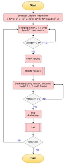 In this research, all of the lithium-ion batteries were LYS347094S from Taiwan’s LYNO Corporation. These batteries’ working voltage and capacity are rated at 3.2 V and 10 Ah. In accordance with the data sheet from the manufacturer, the discharging rates under various temperatures of −10, 0, 10, 20, 30, 40, and 50 °C in a temperature-controlled chamber were tested (DBL45 from Taiwan Dengyng Tec Corporation). These LiFePO4 batteries were discharged under rates of 0.5, 1, 2 and 3 C by a Chroma 17020 battery test station. These batteries were cycled 400 times, within the limits recommended by the manufacturer. Information such as capacity attenuation and number of cycles of the batteriesweare computer recorded. The model was constructed in MATLAB software platform to analyze the recorded discharging curve and perform curve fitting. The experimental setup flowchart is shown in Figure 1.