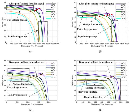 Characteristics of the discharging behaviors and voltage variation with time of LiFePO4 battery exhibit a curve with a very flat voltage plateau and a very obvious voltage drop point. When the capacity is ample, the discharging curve is very stable. Once the voltage drop point is reached, the voltage will rapidly drop suggesting that the remaining capacity will be insufficient, as shown from Figure 2a–d. From the figures, the battery voltage decreases drastically, since the curve goes through a knee point, and eventually drops to the cut-off voltage, at which the battery has been exhausted [43,44,45,46]. Accord to Faraday’s law, the capacity is equal to the integral of current over time. The voltage represents an important characteristic for ample capacity. When the capacity fades, the voltage will be rapid drop, which means that the discharge time before the knee point is significantly reduced [47,48]. The discharge curves between 10 °C and 50 °C can be seen. Before the knee point, the voltage drop is insignificant. Once the knee point is reached, the voltage would rapidly fall [49]. However, the curves of −10 and 0 °C are monotonic. Their knee points are also not obvious. As the discharging rate increases, voltage fluctuation is observable. At the same time, the discharging time of the battery under a low temperature is shorter than that under room temperature and a high temperature. Thus, according to experimental results and comparing LiFePO4 battery discharging between 20 and 50 °C to that of below 10 °C, the latter exhibits worse CE and voltage stability.