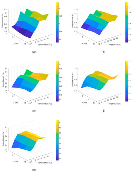 SoHN at different discharging C rates and temperatures during 400 cycles: (a) 1 cycle, (b) 100 cycles, (c) 200 cycles, (d) 300 cycles, and (e) 400 cycles.