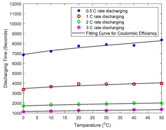From the battery discharging behaviors of Figure 2a–d, fitting curves for the variation of the end of discharging time can be constructed. It is easier to observe the temperature and current dependence of the CE graphically. The curve fitting results are shown in Figure 5, which depicts the difference between measured results and fitted curves. Since the relationship of the CE and temperature in the equivalent circuit model follows the Arrhenius law, while the current obeys Peukert’s law, the CE of the equation has the form of: