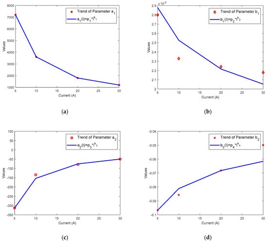 The Peukert law with respect to current can be derived by fitting to obtain the trends of the parameters: (a) trend of a1, (b) trend of b1, (c) trend of a2, and(d) trend of b2.
