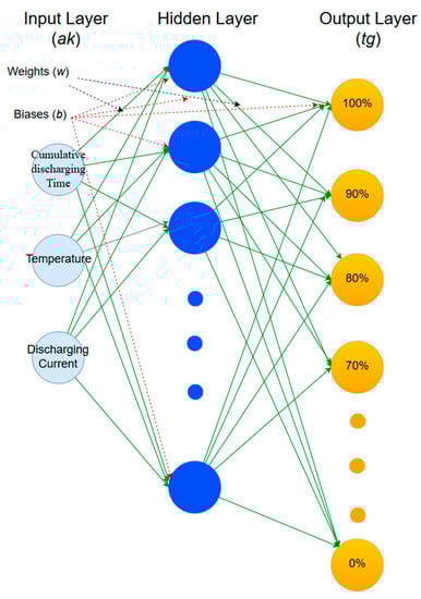 In recent years, machine learning has also been employed for calculations to analyze battery states [38]. Through a great deal of training data, the error between predicted and measured battery performance is minimized. The typical algorithm is an artificial neural network (ANN). In terms of precision, it gives stellar results. Parameters can be calibrated to enable preserving fine performance of the battery in its life cycle [39,40,41,42]. However, since machine learning is based on mathematical optimization, battery behaviors and potential physical phenomena cannot be linked together.