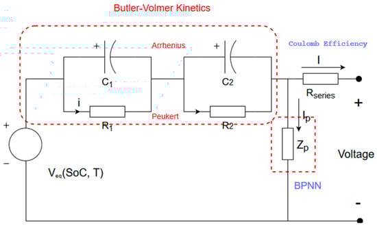 The proposed model is based on a modified Thevenin circuit, Butler–Volmer kinetics, the Arrhenius equation, Peukert’s law, and a back-propagation neural network (BPNN). The model estimates the CE and the remaining capacity of the battery in various environments. The simplifications of the electrochemistry equations make it possible to integrate it into equivalent circuit models in order to predict the battery’s states during real operation.