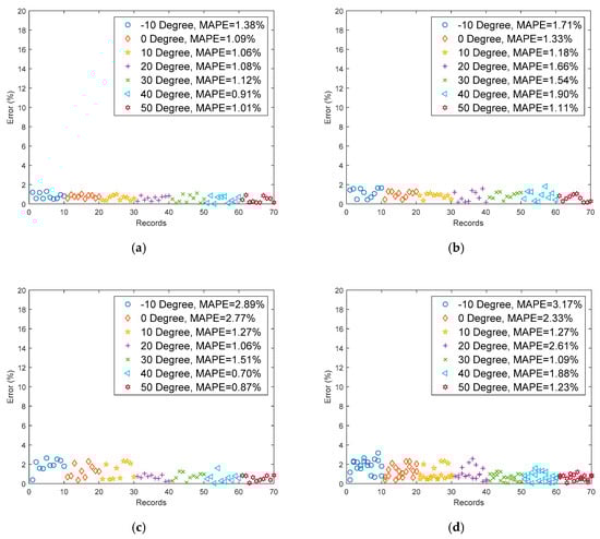 The comprehensive model simultaneously considers the influence of the CE and remaining capacity. In order to verify the correctness of the model, the mean absolute percentage errors (MAPEs) of all tested cases are shown in Figure 9. Overall, the proposed model provides an acceptable estimation result with an MAPE of 1.55% for all the cases tested. As in Figure 9, under room and high temperatures, the proposed model gives a quite satisfying SoC estimation. The estimated SoC are close to the true value, with almost all of the estimation errors being less than 2%. For the SoC estimation under low temperatures, MAPEs vary from 1.06% to 3.71%. It is easily seen from Figure 9d that the estimated SoCs slightly deviate from the true values. As the battery dynamics at low temperature and large C rate are more complicated, SoC estimation is much more difficult. To improve the estimation performance at low temperatures, one practical solution is to increase the amount of training data, particularly for batteries working at low temperatures.
