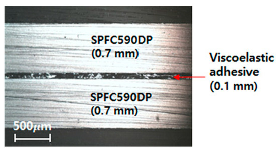 A vibration-damping steel plate is a sandwich-structured steel panel with a viscoelastic adhesive layer between two steel sheets. This plate is mainly considered for car cowl and dash panels, since it not only reduces noise and vibration, but also provides proper mechanical strength. In response to the environmental regulations and market forces for improved fuel economy, the automotive industry has made an effort to enhance fuel efficiency and reduce carbon emissions. One of the key solutions to meet current regulations is weight reduction by application of lightweight materials, including advanced high-strength steel, aluminum alloy, and composites [1,2]. Consequently, dissimilar joining of the vibration-damping steel to lightweight materials is inevitable to realize a variety of lightweight designs for cowl and dash panels. These days, aluminum alloy, in particular, is being increasingly adopted to replace conventional steels as the lightweight material in automobiles. Accordingly, it is necessary to develop dissimilar joining methods of aluminum alloys to the vibration-damping steel sheets.