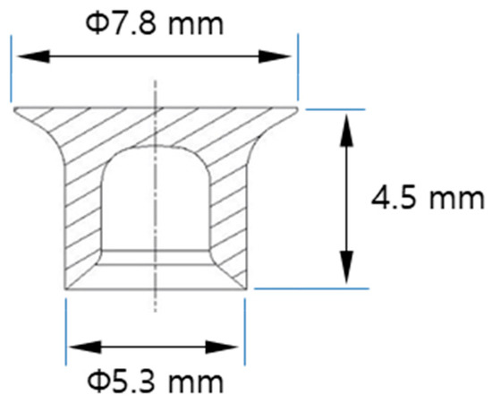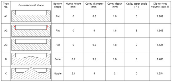 The SPR joints were made from a hydraulic-type riveting machine (Rivset Gen2, BÖLLHOFF) that had a maximum setting force of 78 kN. The rivet (boron steel with Almac® coating (combination of aluminum and zinc), 480 ± 30 HV in hardness, supplied by BÖLLHOFF) with a flat countersunk was used in the SPR process. The engineering drawing of the rivet is illustrated in Figure 2. The rivet shank diameter and rivet length were 5.3 mm and 4.5 mm, respectively. The rivet length of 4.5 mm was selected to be approximately 2 mm thicker than the total thickness of base materials (2.6–2.7 mm). In this study, three die types (supplied by BÖLLHOFF) were tested to investigate the effect of the die geometry on the joining performance. Geometrical information of these dies is presented in Figure 3. Type A1 (diameter: 8.8 mm, depth: 1.8 mm) die was a benchmark die that had a basic flat-bottom shape, and both type B (diameter: 9.5 mm, depth: 1.8 mm) and type C (diameter: 9.0 mm, depth: 2.0 mm) had a hump at the center of the die cavity. The hump of type B was conical and the height of the hump was smaller than the depth of the die cavity. However, the hump height of type C was larger than the depth of the die cavity, resulting in more extrusion. In addition, for the benchmark die, the influence of cavity diameter and cavity taper angle on the joint characteristic was examined. In this examination, two modified benchmark dies (type A2 and A3) were used. Type A2 die had a cavity taper angle of 5° (which was 5° more than that of type A1), and type A3 die had a diameter of 9.2 mm (which was 0.2 mm more than that of type A1).