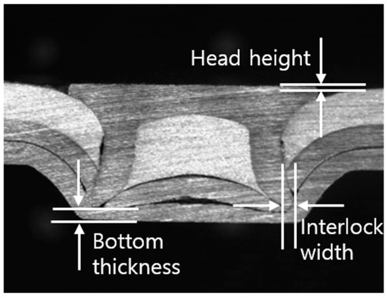 Cross-sectional analysis of the SPR joint was carried out to determine the geometrical features of the SPR joint. For this, three geometrical indices of the SPR joint were measured, as presented in Figure 4—head height (the distance between the surface of the rivet head and upper surface of the top sheet), interlock width (the distance between the tip of the deformed rivet shank and the pierced point of the top sheet), and bottom thickness (remaining thickness of the bottom sheet after the riveting). In this study, after the preliminary SPR joining experiments, the setting force (or riveting load) of the riveting machine was carefully selected to be 27–42 kN, so that all joints made from various die types and joint configurations could have a head height of 0 ± 0.05 mm. The head height of the joint was measured with a dial gauge, and the interlock width and bottom thickness were measured by an optical microscope system with an image analysis tool.