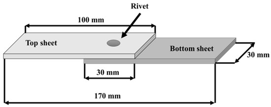 The mechanical performance of the SPR joint was examined by a tensile–shear test (test machine: Universal Testing Machine of Shimadzu AG-300kNX with a maximum load capacity of 30 ton). Specimen dimensions and test procedure for the tensile–shear test conformed to KS B ISO 14,273 standard. Figure 5 shows the schematic diagram of the tensile–shear test specimen. The test was carried out at a crosshead speed of 5 mm/min.
