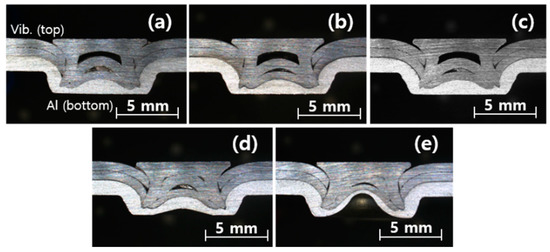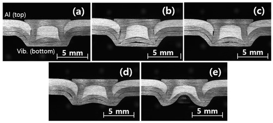 Cross-sectional images of SPR joints of Al5052-H32 (top) and vibration-damping steel (bottom) with respect to SPR die type. (a) Type A1 die, (b) type A2 die, (c) type A3 die, (d) type B die, and (e) type C die.