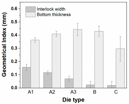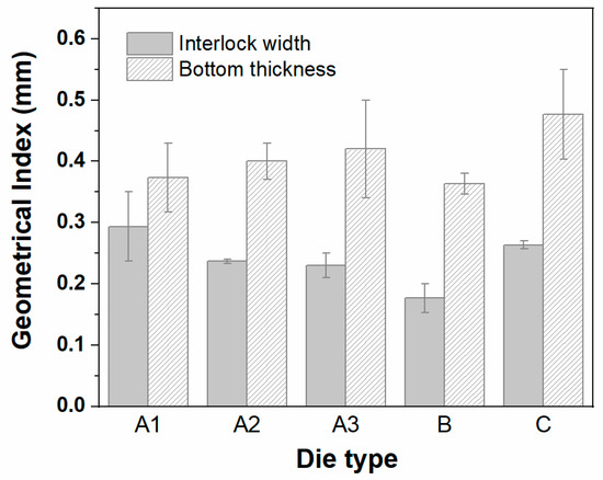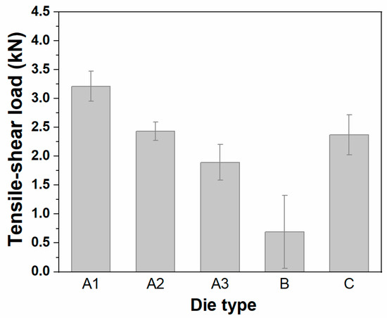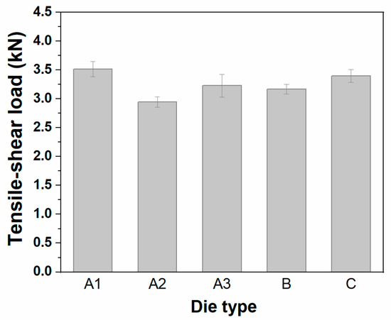 The tensile–shear load of the specimens is shown in Figure 8. The joint made from the type A1 die had the highest tensile–shear load, owing to the large interlock width, and it decreased with the decrease of the interlock width (refer to Figure 7 and Figure 8). However, the tensile–shear load of the joint formed by a type C die was relatively high, even though it had the smallest interlock width, as presented in Figure 7. This is due to the fact that the type C die had a relatively small die-to-rivet ratio (R = 1.254), which imposed more constraints on the bottom material. This may have further induced the strain hardening of the bottom sheet (Al5052-H32), contributing to the overall improvement in the joint’s mechanical performance.