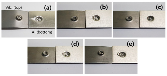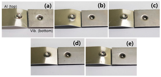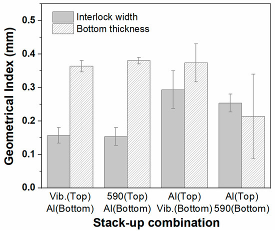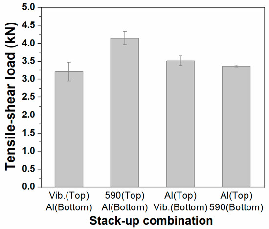 The tensile–shear loads of the SPR joints of the stack configurations are presented in Figure 16. For the Al5052-H32 bottom configuration, the tensile–shear load of the joint made from SPFC590DP was 22.6% larger than that made from the vibration-damping steel, despite the interlock width of the two joints being similar. This difference (~1 kN) in the tensile–shear load of the two joints was attributable to the difference in the intrinsic mechanical properties of the base materials. The flexural rigidity of the vibration-damping steel was less than SPFC590DP, so more bending of the vibration-damping steel occurred than the SPFC590DP as the top sheet in the lap shear test, which led to inter-locking failure in the earlier stage [19,24]. However, the tensile–shear load of the joint made from the vibration-damping steel was slightly larger than that of the joint made from SPFC590DP when Al5052-H32 was used as a top sheet. This was mainly due to the larger interlock width of the joint made from the vibration-damping steel.