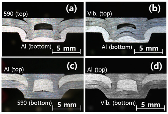 Comparison of failure modes of the SPR joint (fabricated by type A1 die) for different stack-up combinations. (a) SPFC590DP (top) and Al5052-H32 (bottom), (b) vibration-damping steel (top) and Al5052-H32 (bottom), (c) Al5052-H32 (top) and SPFC590DP (bottom), and (d) Al5052-H32 (top) and vibration-damping steel (bottom).