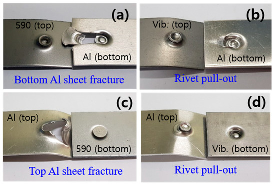 The failure images of the joints are shown in Figure 13. The rivet pull-out failure was observed for all specimens. As discussed in Section 3.1, these pull-out failures were due to the fact that the interlock width, which was much greater than that of the reversed stack, was still not enough to induce other failure modes such as top sheet tearing and rivet fracture.