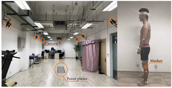 The human gait data acquisition experiment was carried out in the Human Gait Capture System Laboratory of Xi’an Jiaotong University, China. All subjects were instructed to walk naturally at a comfortable speed along a walkway for about 5 min and kinematic values of thenlower extremity were obtained through a 10-camera video-based motion capture system (VICON system, Oxford Metrics Limited, UK) operating at 100 Hz. This experiment focused on the right joint rotations (hip, knee, and ankle) in the sagittal plane, i.e., flexion-extension. We hypothesized there would be no difference between the right and left limb. The gait cycle was defined as from the first to second heel strike on the ipsilateral side by the assistance of ground reaction force data recorded using three staggered force platforms, 1500 Hz, embedded in the walkway. The relevant equipment and a participant with markers are shown in Figure 1.